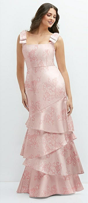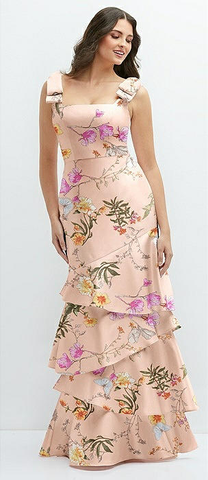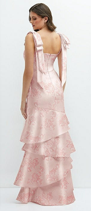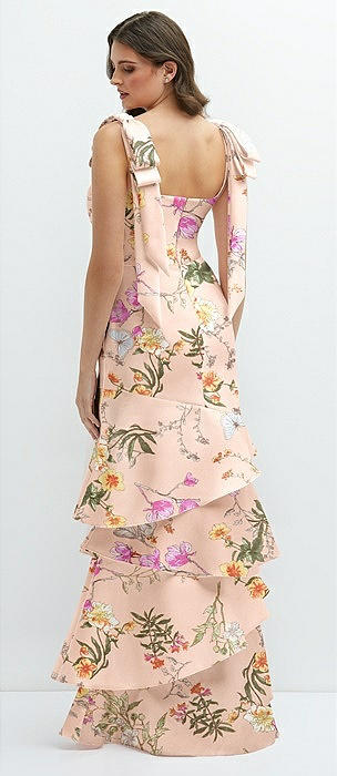 Floral Bow-Shoulder Satin Maxi Dress with Asymmetrical Tiered Skirt in butterfly botanica pink sand