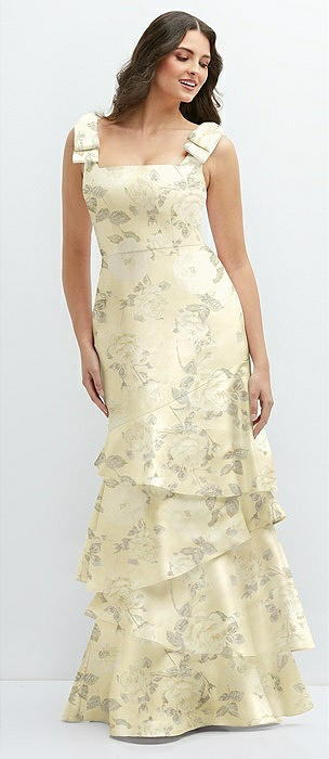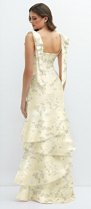 Floral Bow-Shoulder Satin Maxi Dress with Asymmetrical Tiered Skirt in butter yellow floral
