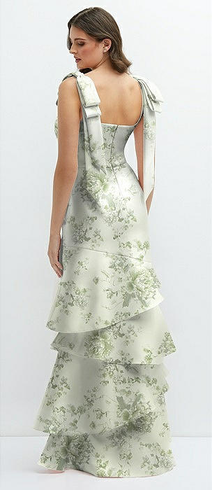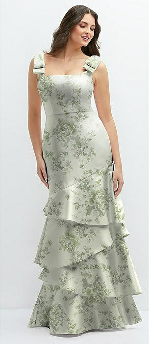 Floral Bow-Shoulder Satin Maxi Dress with Asymmetrical Tiered Skirt in sage cottage rose