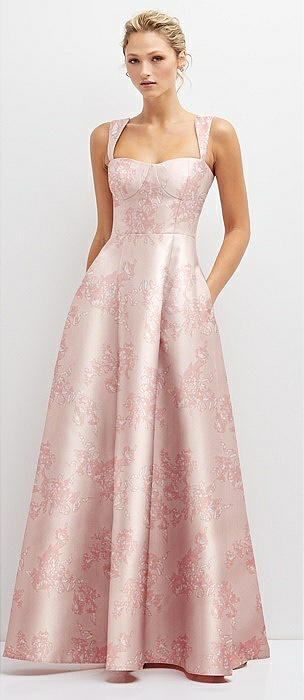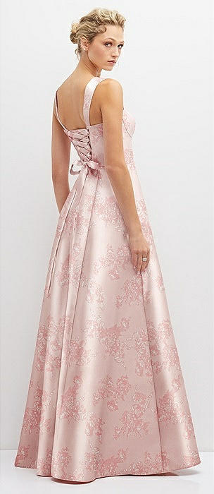 Floral Lace-Up Back Bustier Satin Dress with Full Skirt and Pockets in butterfly botanica pink sand