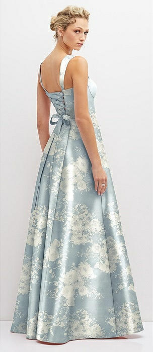 Floral Lace-Up Back Bustier Satin Dress with Full Skirt and Pockets in porcelain blue seraphina floral