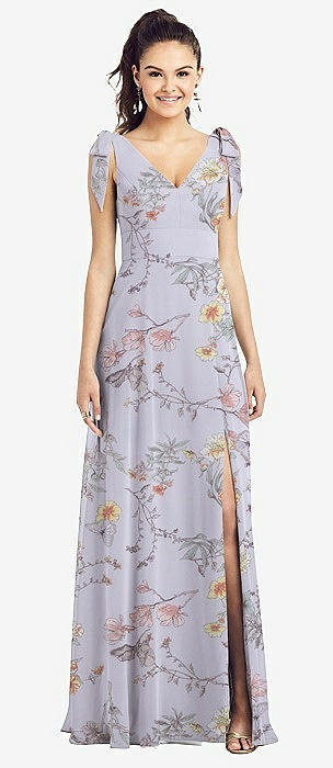 Bow-Shoulder V-Back Chiffon Gown with Front Slit in butterfly botanica silver dove