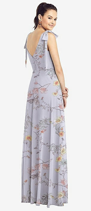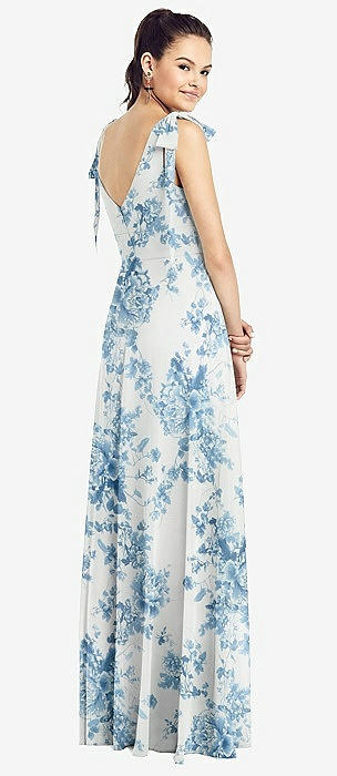 Bow-Shoulder V-Back Chiffon Gown with Front Slit in coquette floral print