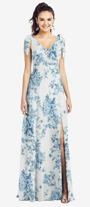 Bow-Shoulder V-Back Chiffon Gown with Front Slit in cottage rose dusk blue