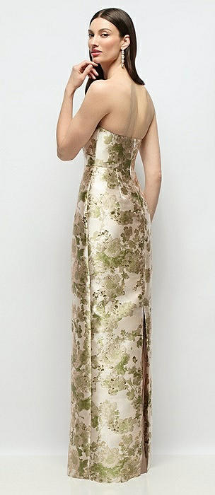 Strapless Abstract Floral Jacquard Column Dress with Back Slit in peridot blush