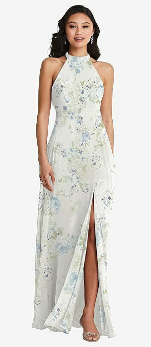 Stand Collar Halter Maxi Dress with Criss Cross Open-Back in cottage rose dusk blue