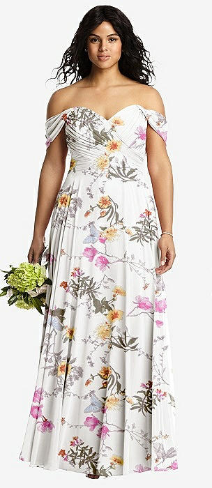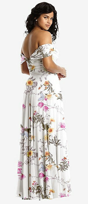 Off-the-Shoulder Draped Chiffon Maxi Dress in butterfly botanica ivory