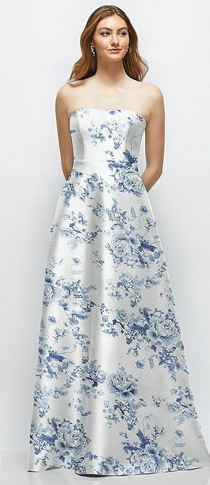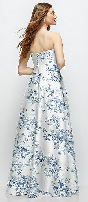 Strapless Floral Satin Gown with Full Skirt and Covered Buttons at Back in porcelain blue seraphina floral