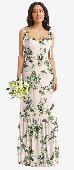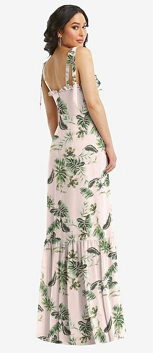 Tie-Shoulder Bustier Bodice Ruffle-Hem Maxi Dress in palm beach print