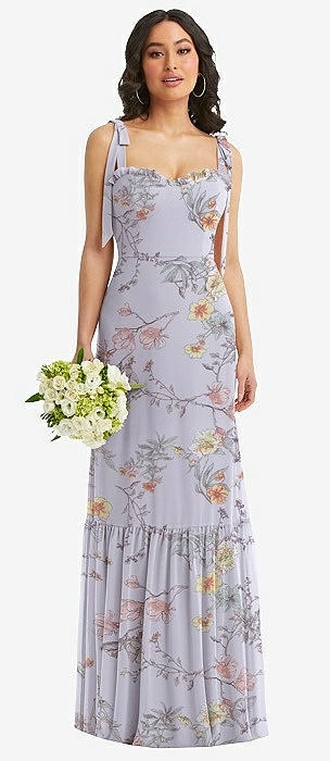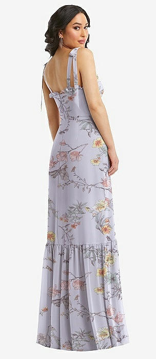 Tie-Shoulder Bustier Bodice Ruffle-Hem Maxi Dress in butterfly botanica silver dove