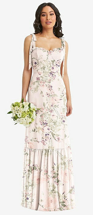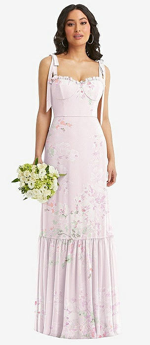 Tie-Shoulder Bustier Bodice Ruffle-Hem Maxi Dress in blush garden