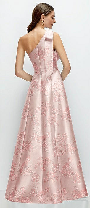 Bow One-Shoulder Full A-Line Floral Satin Maxi Dress in butterfly botanica pink sand