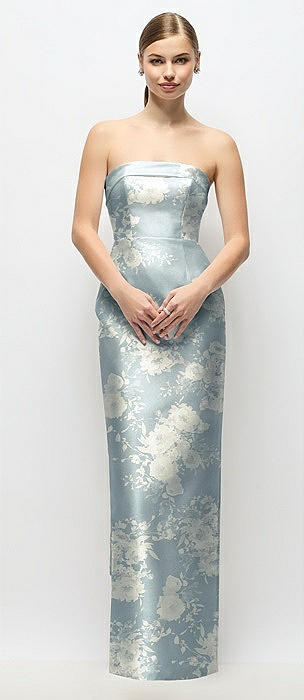 Strapless Cuff Floral Satin Maxi Dress with Column Skirt & Back Bow in cottage rose larkspur