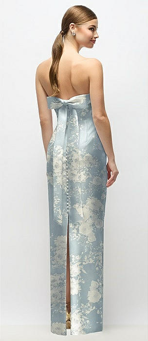 Strapless Cuff Floral Satin Maxi Dress with Column Skirt & Back Bow in bow and blossom print