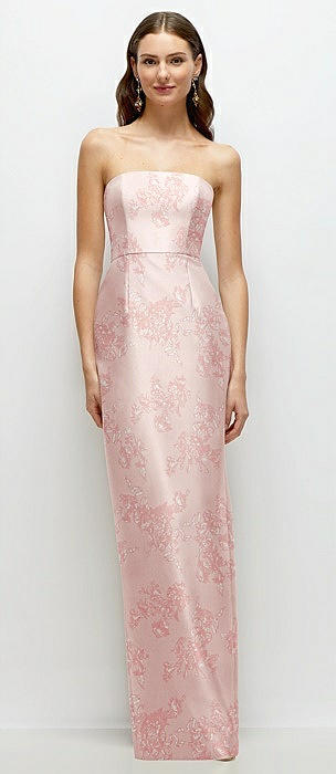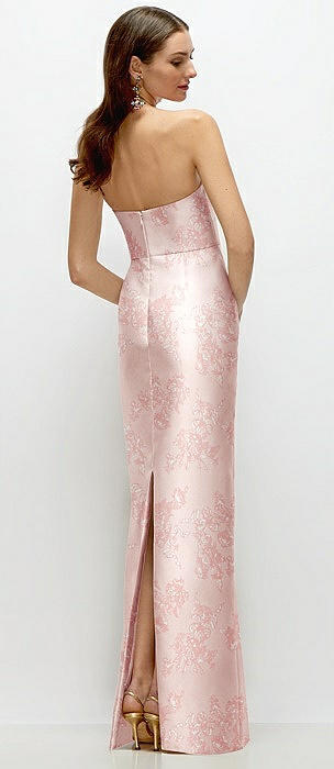 Strapless Floral Satin Column Dress with Back Slit in cottage rose larkspur