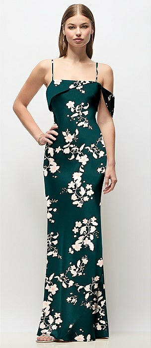 Asymmetrical Cuff Neck Floral Stretch Satin Bias Maxi Dress with Adjustable Spaghetti Straps in vintage primrose evergreen