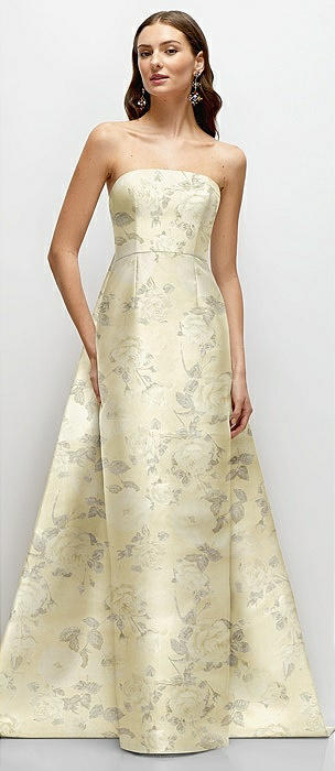 Strapless Floral Satin Column Dress with Removeable Watteau Train in butter yellow floral