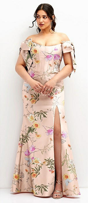 Off-the-Shoulder Bow Floral Satin Corset Dress with Fit and Flare Skirt in butterfly botanica pink sand