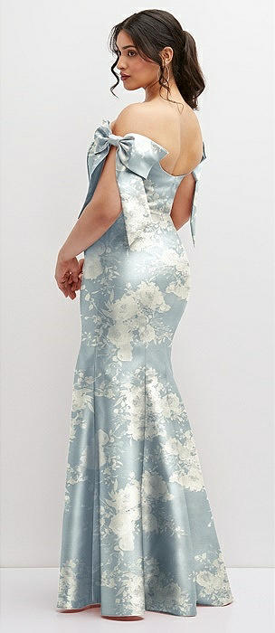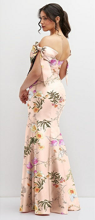 Off-the-Shoulder Bow Floral Satin Corset Dress with Fit and Flare Skirt in bow and blossom print