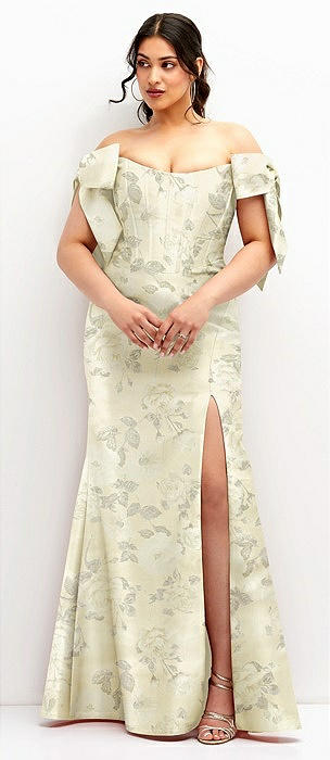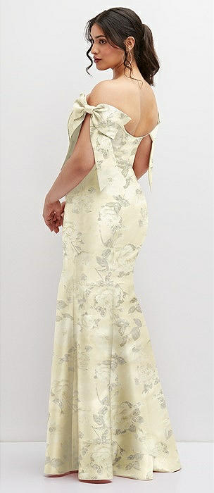 Off-the-Shoulder Bow Floral Satin Corset Dress with Fit and Flare Skirt in butter yellow floral