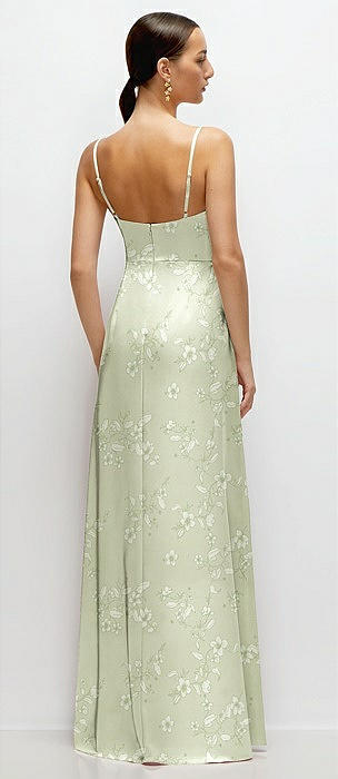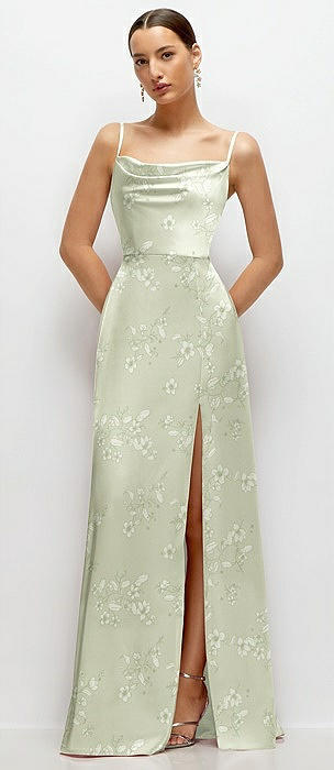 Floral Cowl Neck Satin Maxi Dress with Adjustable Spaghetti Straps in vintage primrose celadon