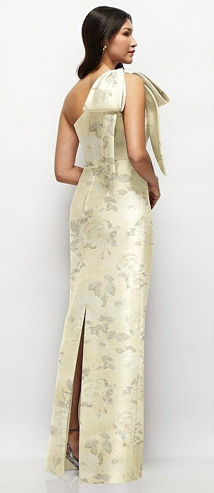 Oversized Bow One-Shoulder Floral Satin Column Maxi Dress in butter yellow floral