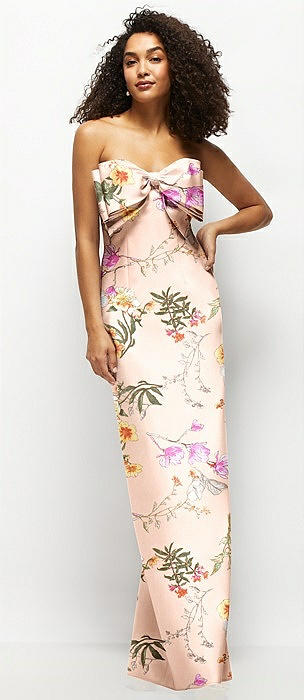 Strapless Floral Satin Column Maxi Dress with Oversized Bow in bow and blossom print