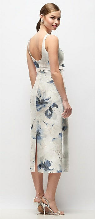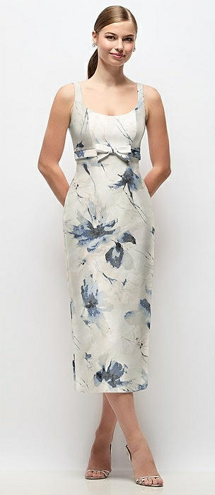 Scoop Neck Floral Satin Column Midi Dress with Bow at Empire Waist in inkwash blue floral