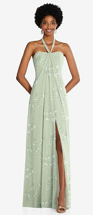 Draped Chiffon Grecian Column Gown with Convertible Straps in mint green floral