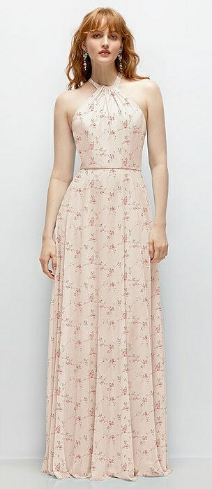 High-Neck Halter Open-Back Floral Satin Trumpet Dress in cottage rose larkspur