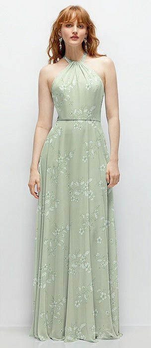 High-Neck Halter Open-Back Floral Satin Trumpet Dress in sage cottage rose