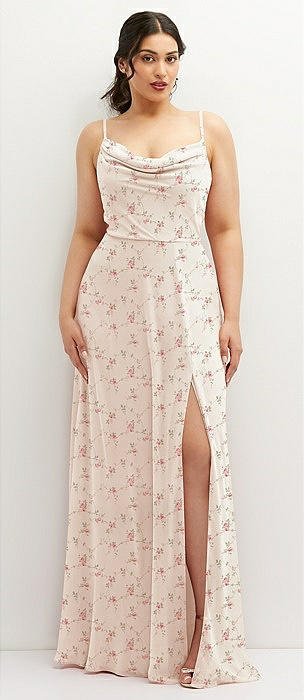 Floral Cowl Neck Satin Maxi Dress with Adjustable Spaghetti Straps in vintage primrose evergreen
