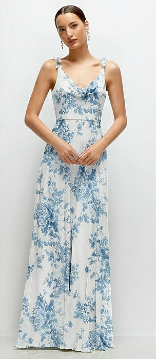 Floral Satin Corset Maxi Dress with Ruffle Straps & Skirt in bow and blossom print