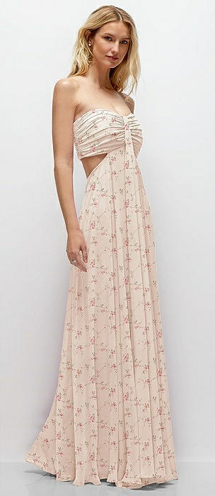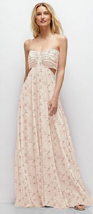 Strapless Empire Waist Cutout Maxi Dress with Covered Button Detail in blush garden