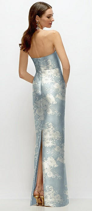 Strapless Floral Satin Column Dress with Back Slit in cottage rose larkspur