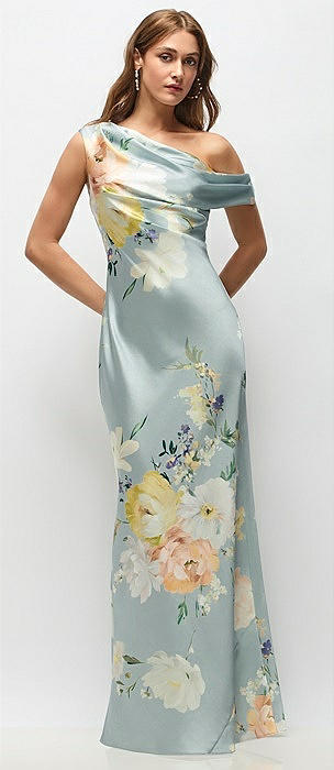 Draped One-Shoulder Bias Painterly Floral Stretch Satin Maxi Dress in mist multi