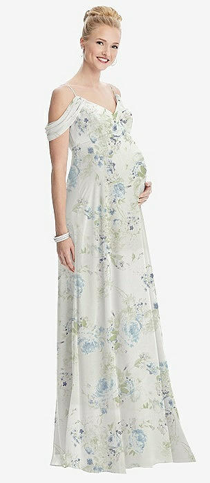 Draped Cold-Shoulder Chiffon Maternity Dress in butterfly botanica ivory
