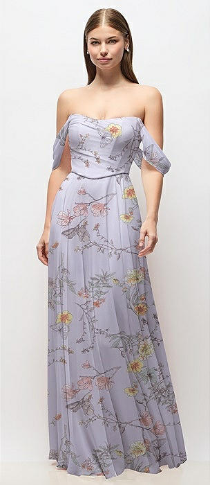Off-the-Shoulder Basque Corset Floral Chiffon Maxi Dress in butterfly botanica silver dove