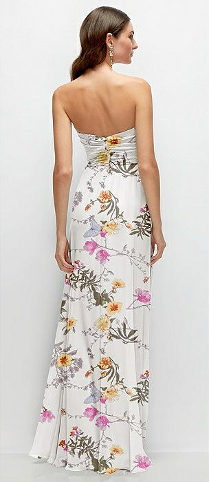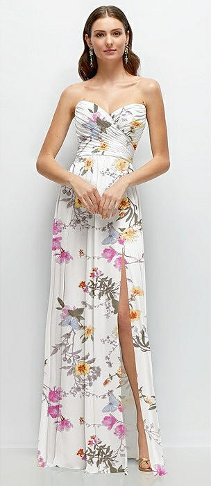 Strapless Pleated Surplice Chiffon Maxi Dress with A-Line Skirt in butterfly botanica ivory