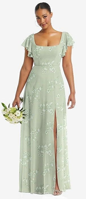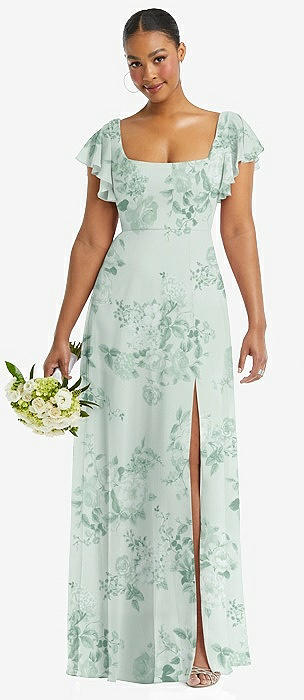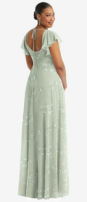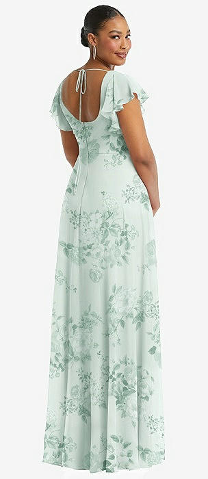 Flutter Sleeve Scoop Open-Back Chiffon Maxi Dress in mint green floral