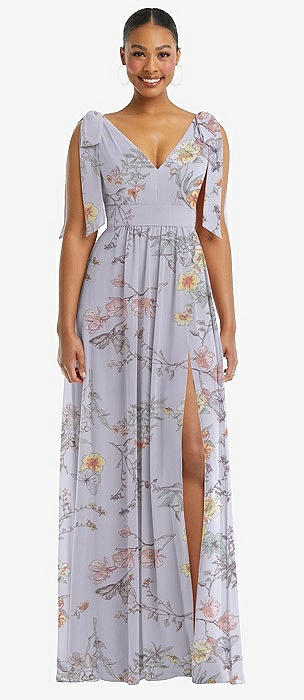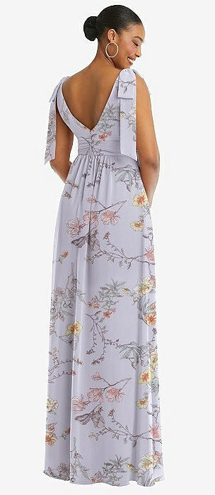 Plunge Neckline Bow Shoulder Empire Waist Chiffon Maxi Dress in butterfly botanica silver dove