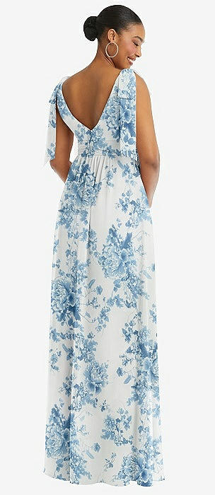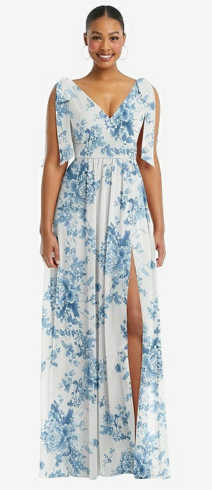 Plunge Neckline Bow Shoulder Empire Waist Chiffon Maxi Dress in cottage rose dusk blue