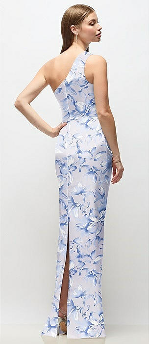 One-Shoulder Draped Bodice Floral Stretch Satin Column Maxi Dress in magnolia sky