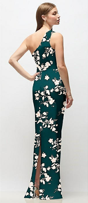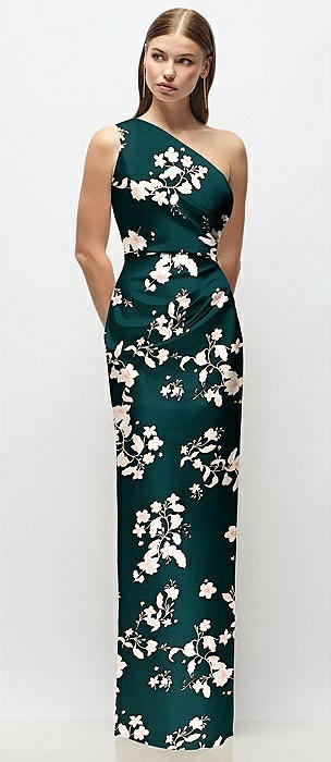 One-Shoulder Draped Bodice Floral Stretch Satin Column Maxi Dress in vintage primrose evergreen