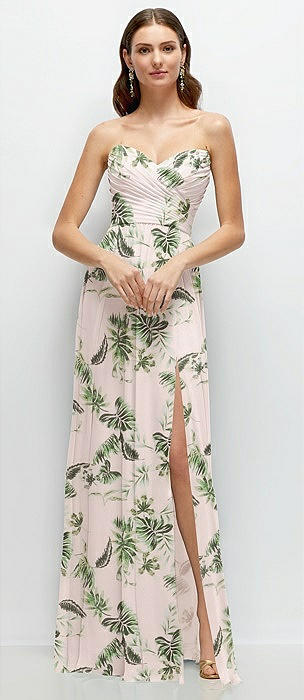 Strapless Pleated Surplice Chiffon Maxi Dress with A-Line Skirt in palm beach print
