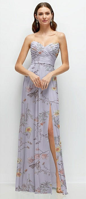 Strapless Pleated Surplice Chiffon Maxi Dress with A-Line Skirt in butterfly botanica silver dove