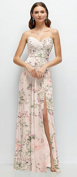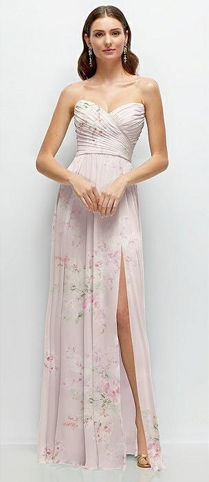 Strapless Pleated Surplice Chiffon Maxi Dress with A-Line Skirt in blush garden