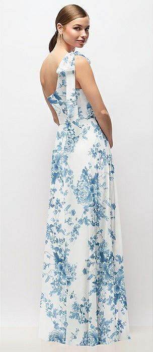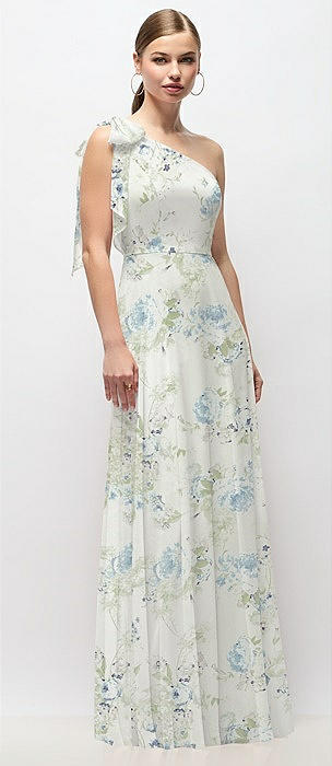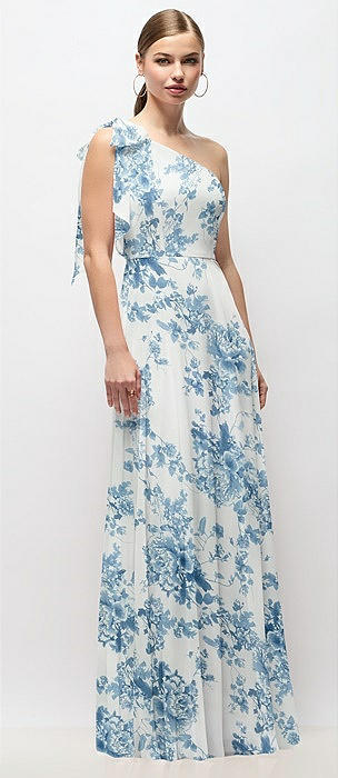 Draped One-Shoulder Maxi Dress with Scarf Bow in watercolor print