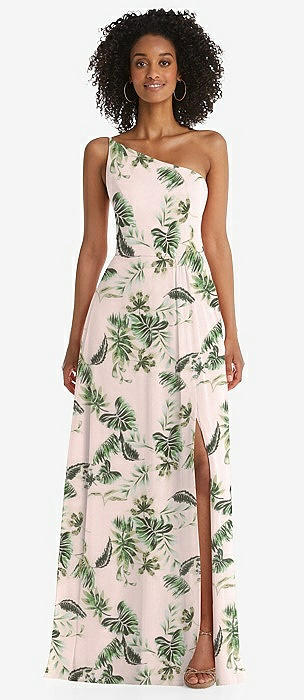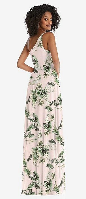 One-Shoulder Chiffon Maxi Dress with Shirred Front Slit in palm beach print