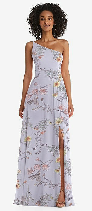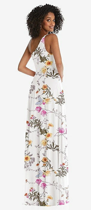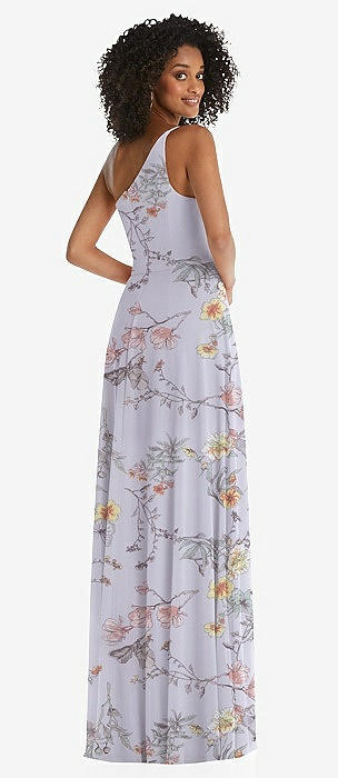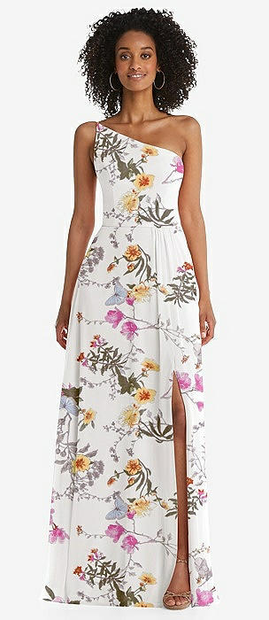 One-Shoulder Chiffon Maxi Dress with Shirred Front Slit in butterfly botanica silver dove